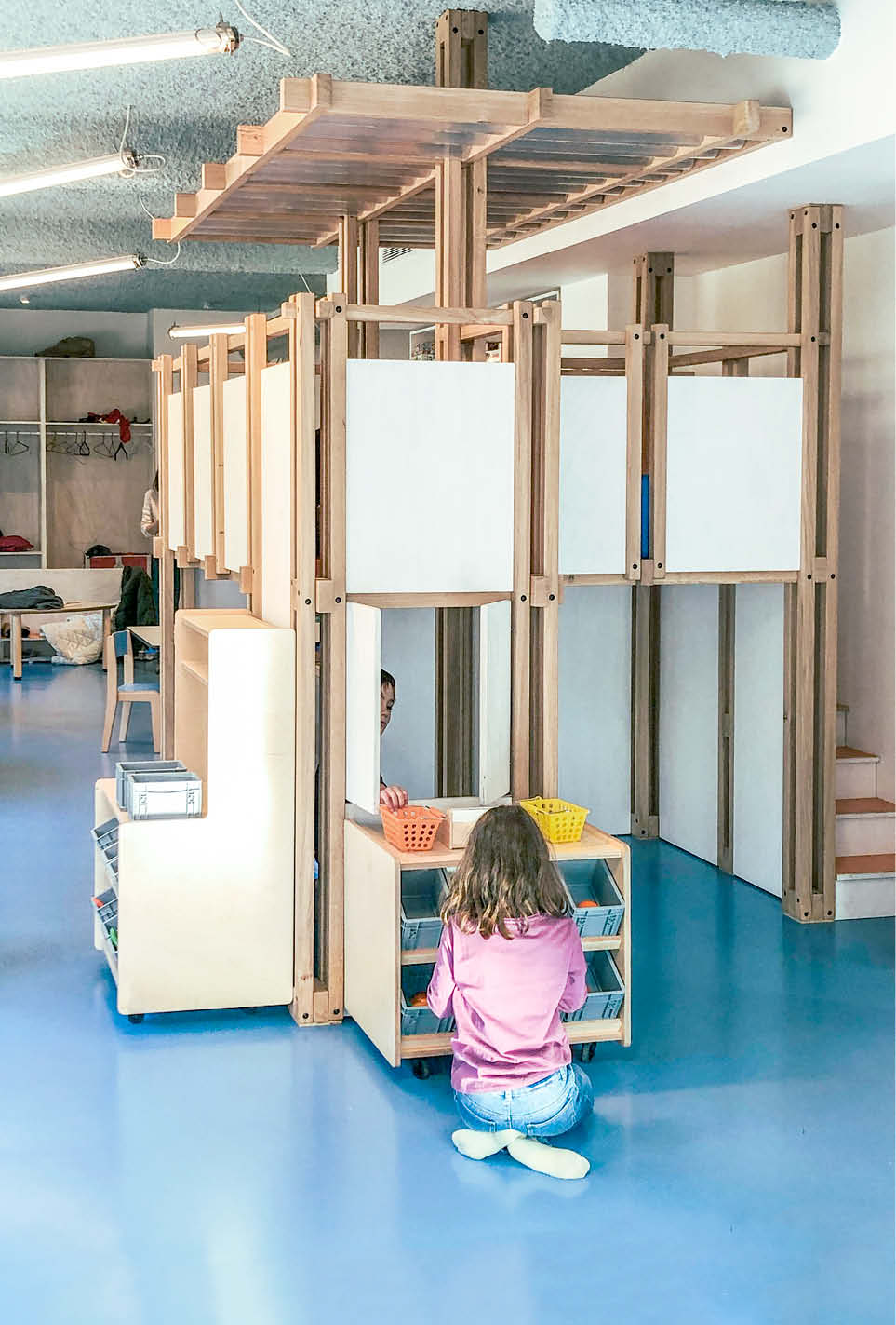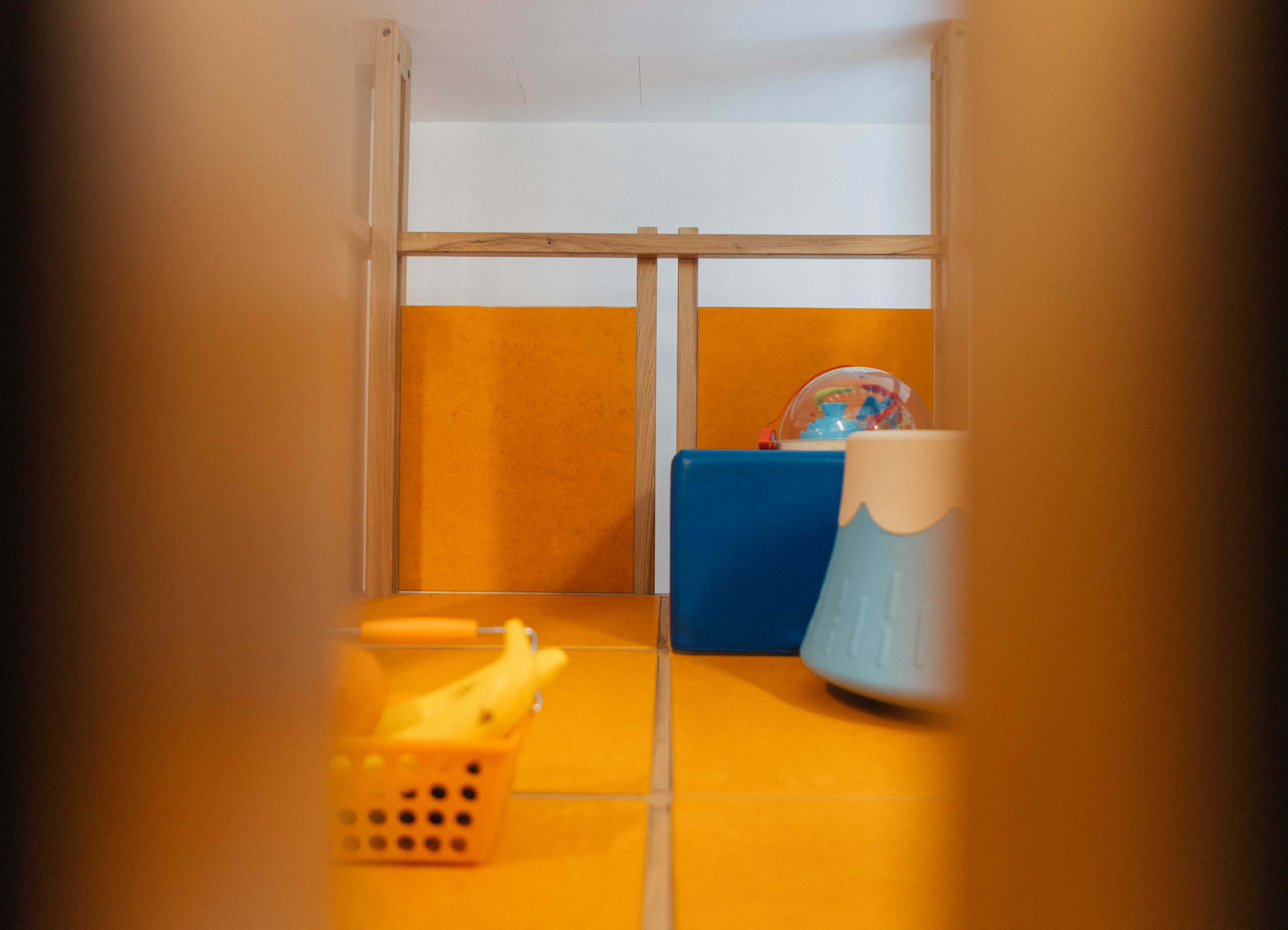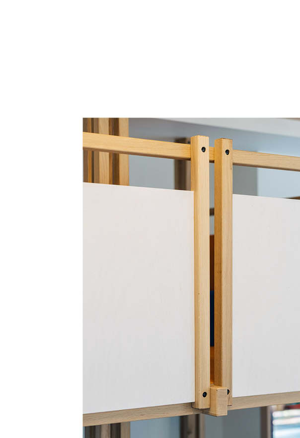 La structure est réalisé en chêne massif avec un système d’assemblages en moisage japonais et les murs sont réalisés en contreplaqué de sapin teint. A l’étage de la mezzanine un linoléum naturel orange vient tapisser le sol et les cloison offrant, aux enfants seulement, un univers coloré