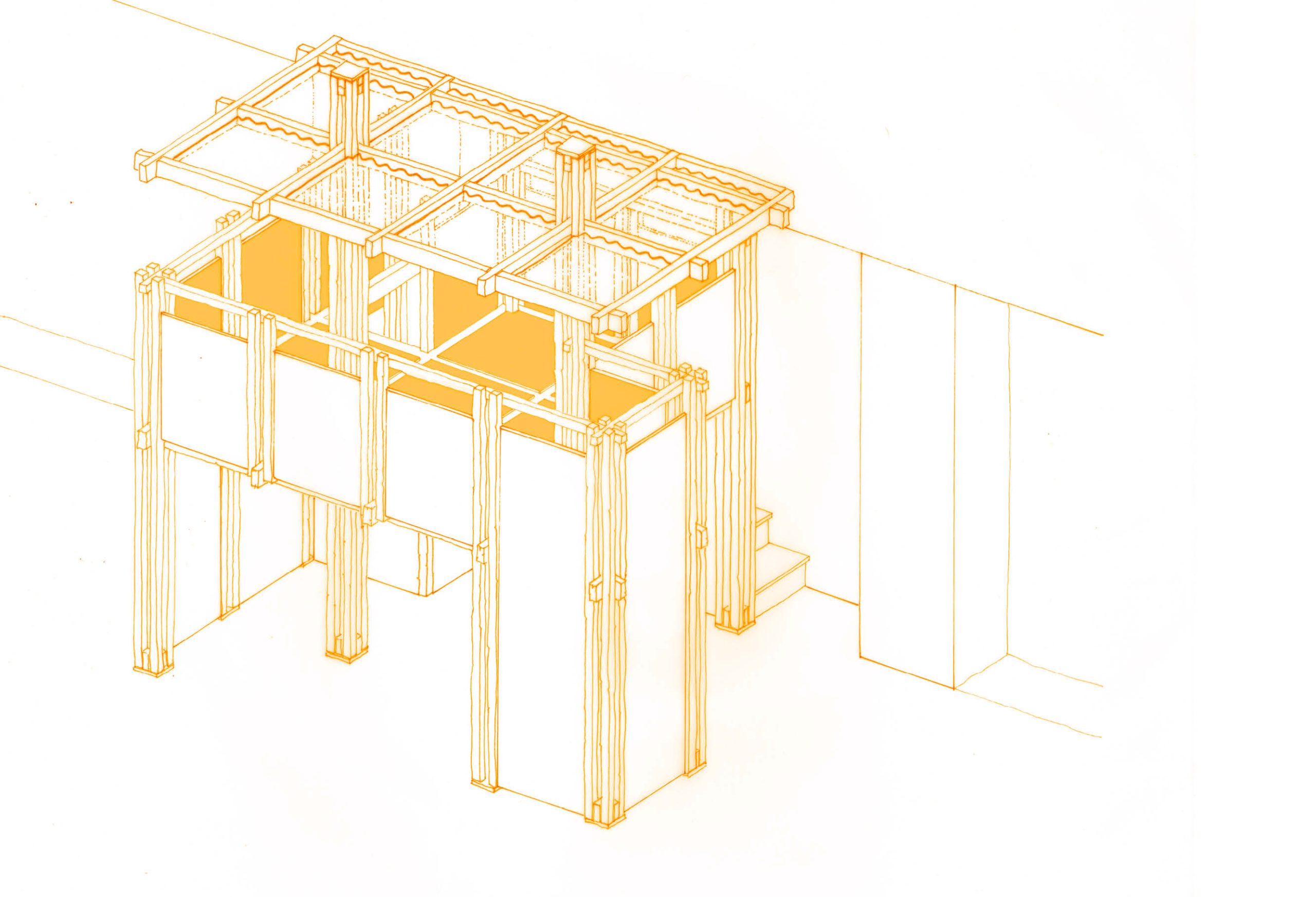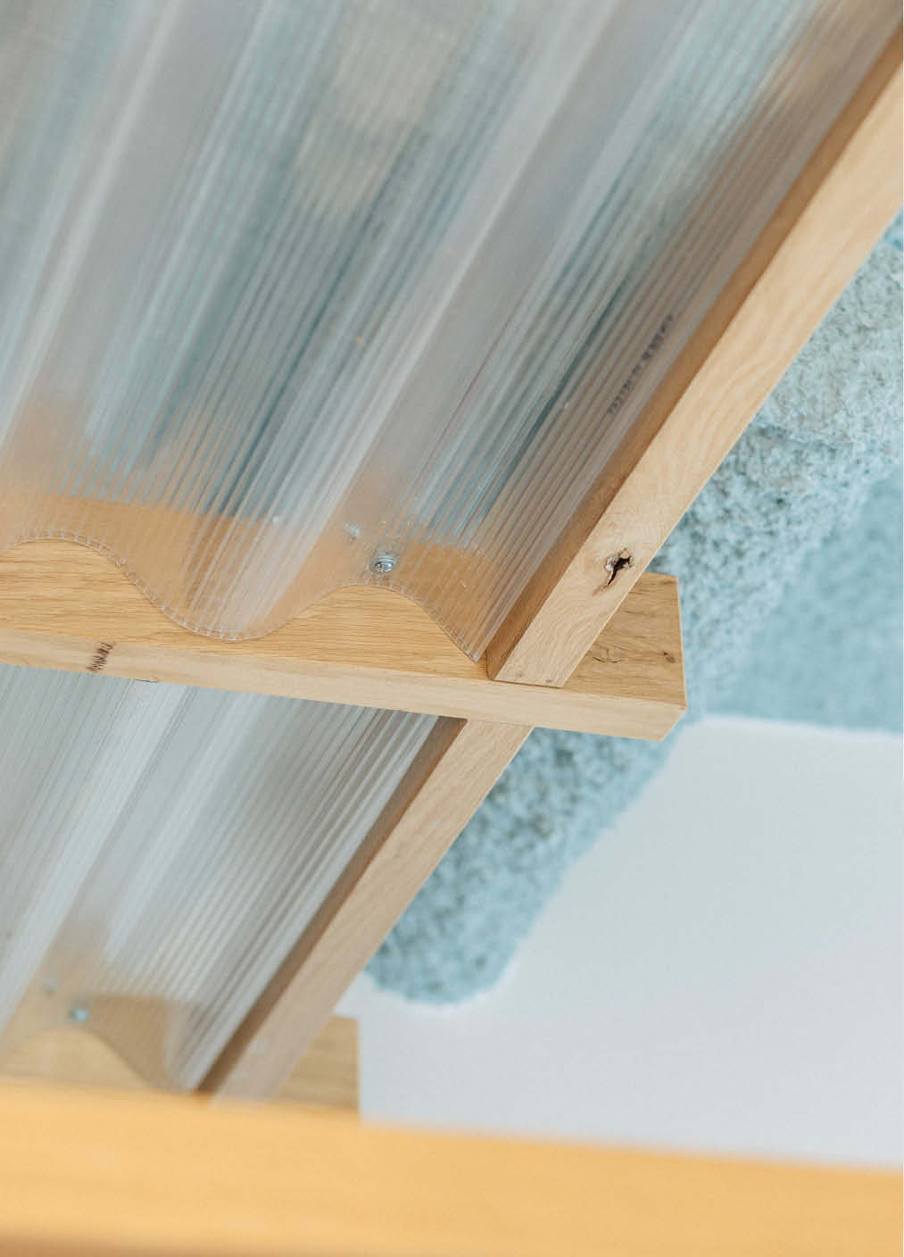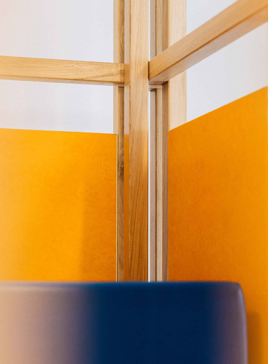 La structure est réalisé en chêne massif avec un système d’assemblages en moisage japonais et les murs sont réalisés en contreplaqué de sapin teint. A l’étage de la mezzanine un linoléum naturel orange vient tapisser le sol et les cloison offrant, aux enfants seulement, un univers coloré