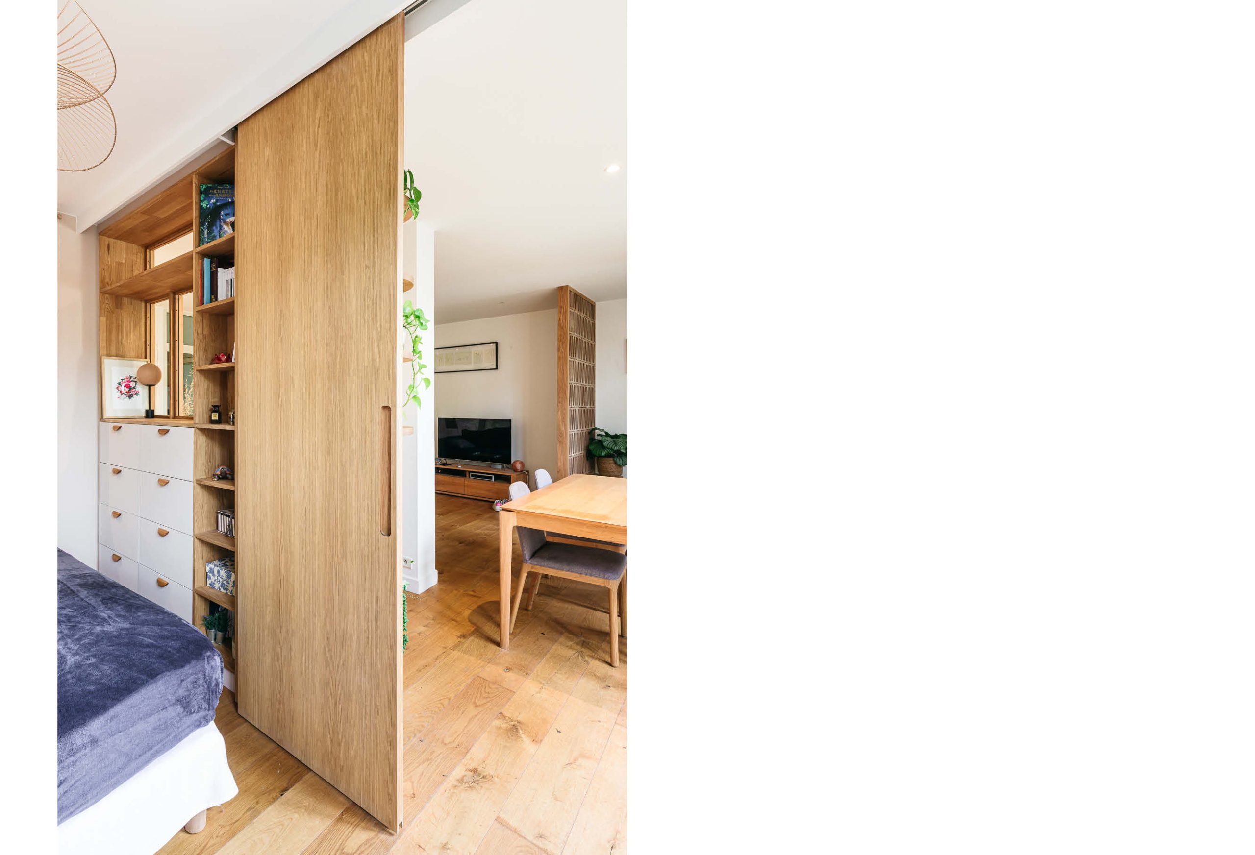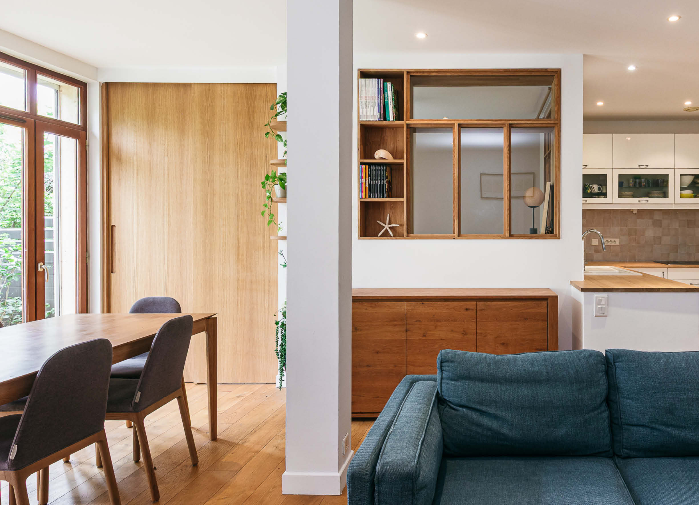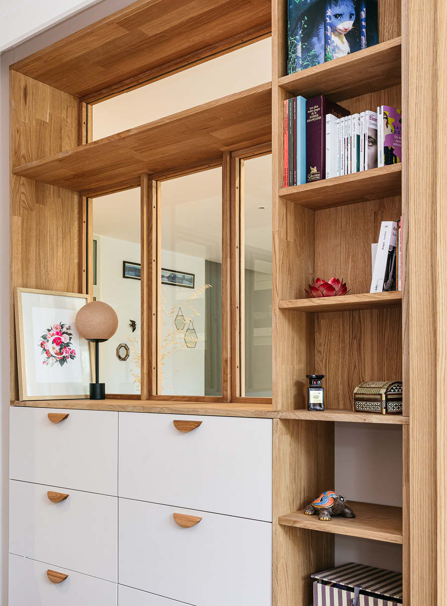 Dans le séjour, création d’une chambre supplémentaire ouverte avec des verrières, une grande porte coulissante en chêne et divers aménagements sur mesure.