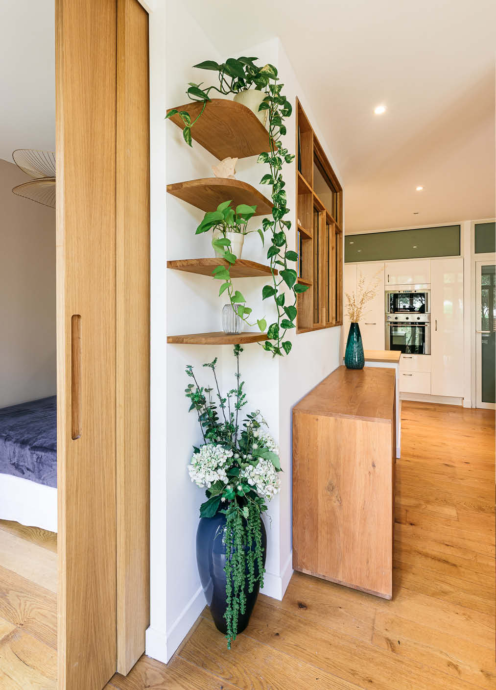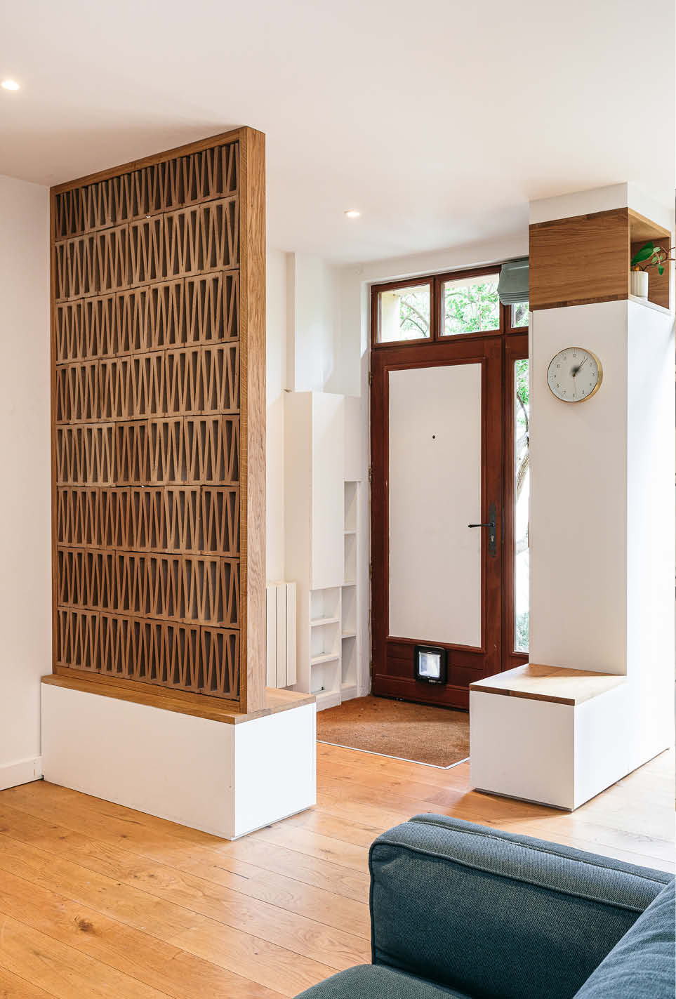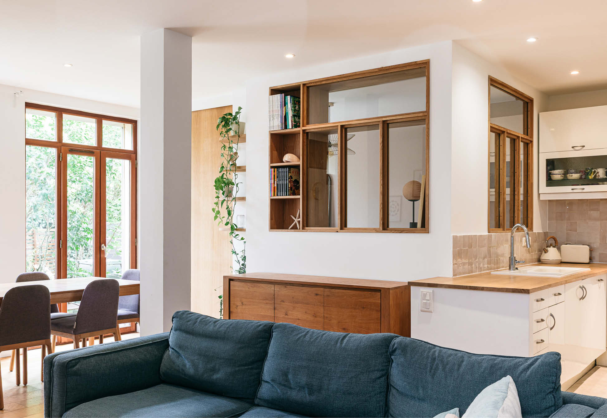 Dans le séjour, création d’une chambre supplémentaire ouverte avec des verrières, une grande porte coulissante en chêne et divers aménagements sur mesure.