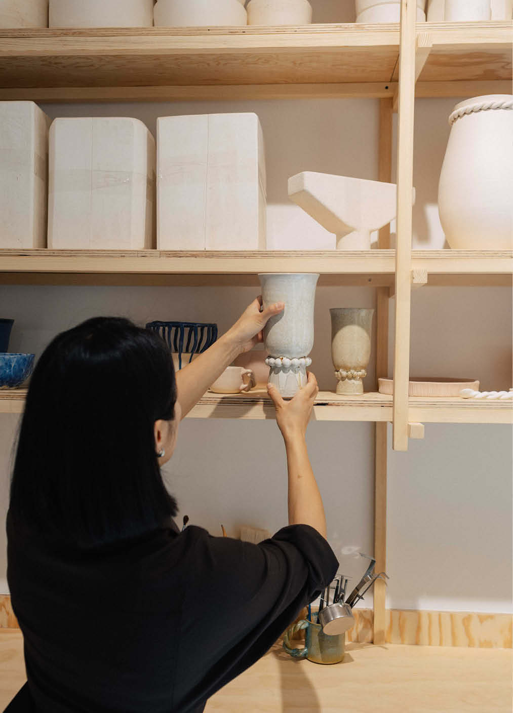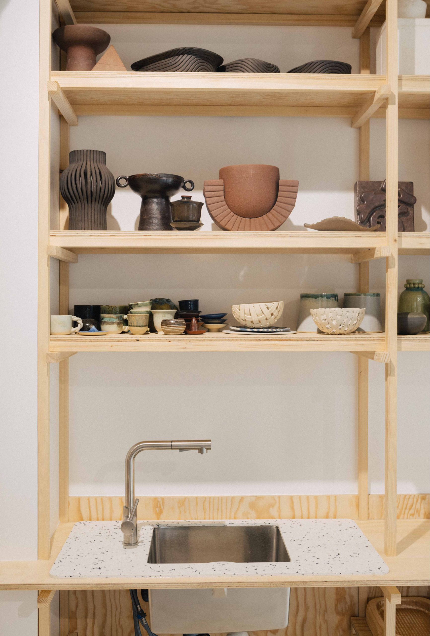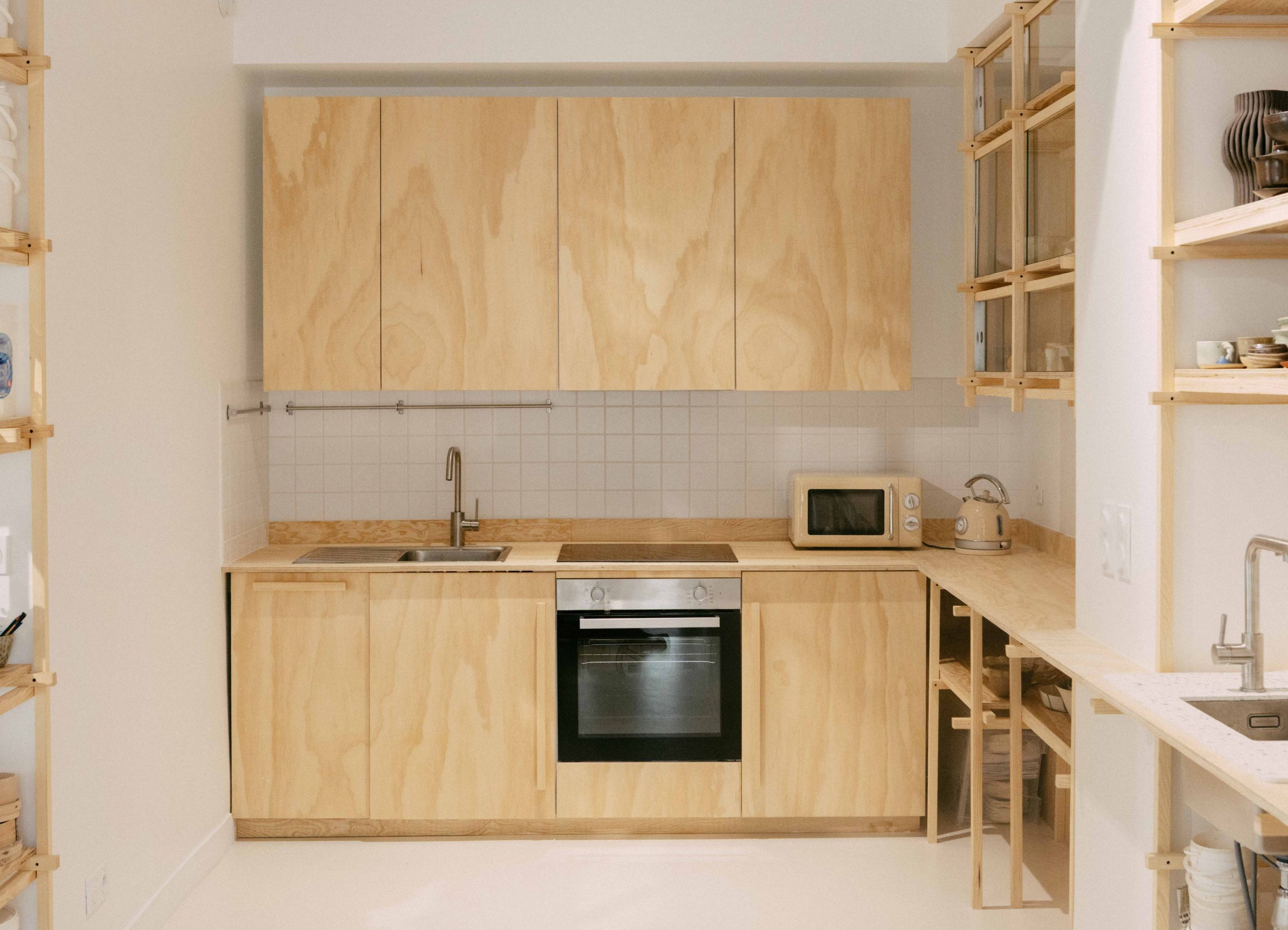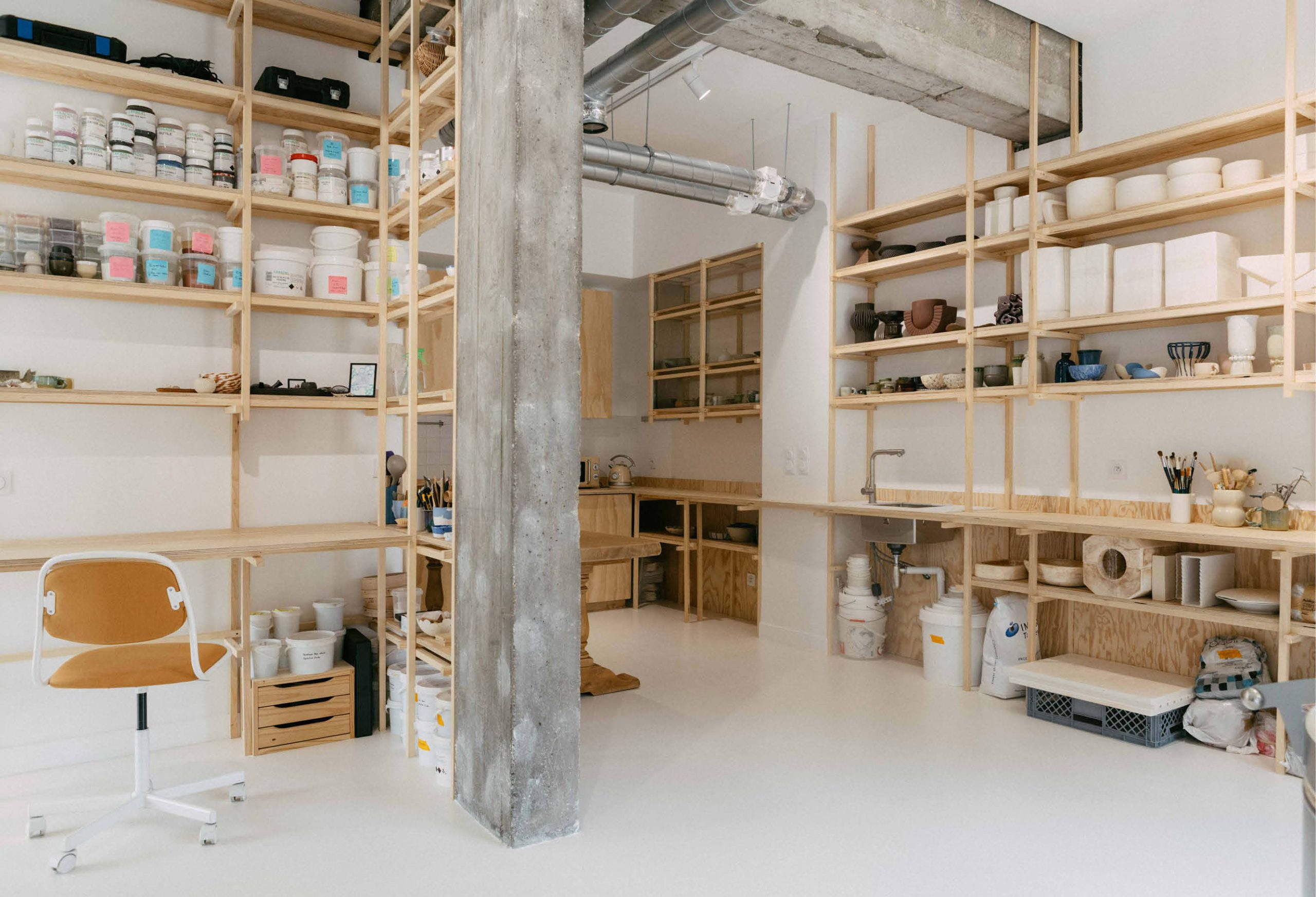 En collaboration avec l’architecte Amine Slimani de rdta studio, nous avons conçu et fabriqué l’ensemble du mobilier de travail et d’exposition pour la céramiste Tianyi Zhou à Ivry-sur-Seine. Le projet comprend la réalisation d’une cuisine, d’un meuble à émaux, d’une vitrine, de grands linéaires de rangement ainsi que de plusieurs postes de travail.