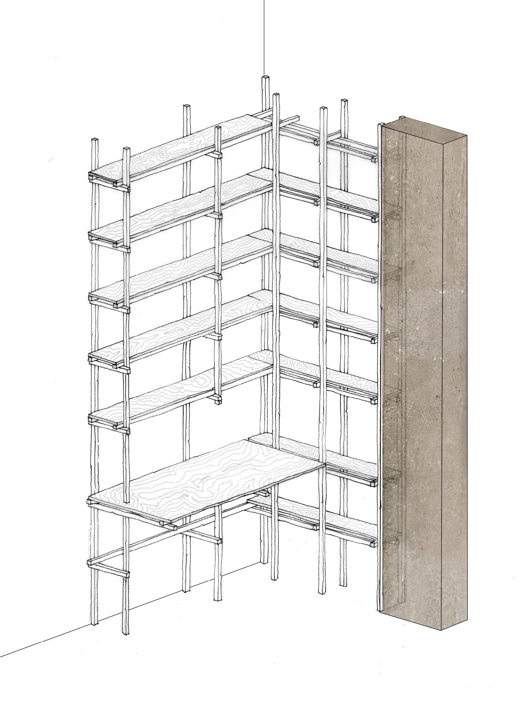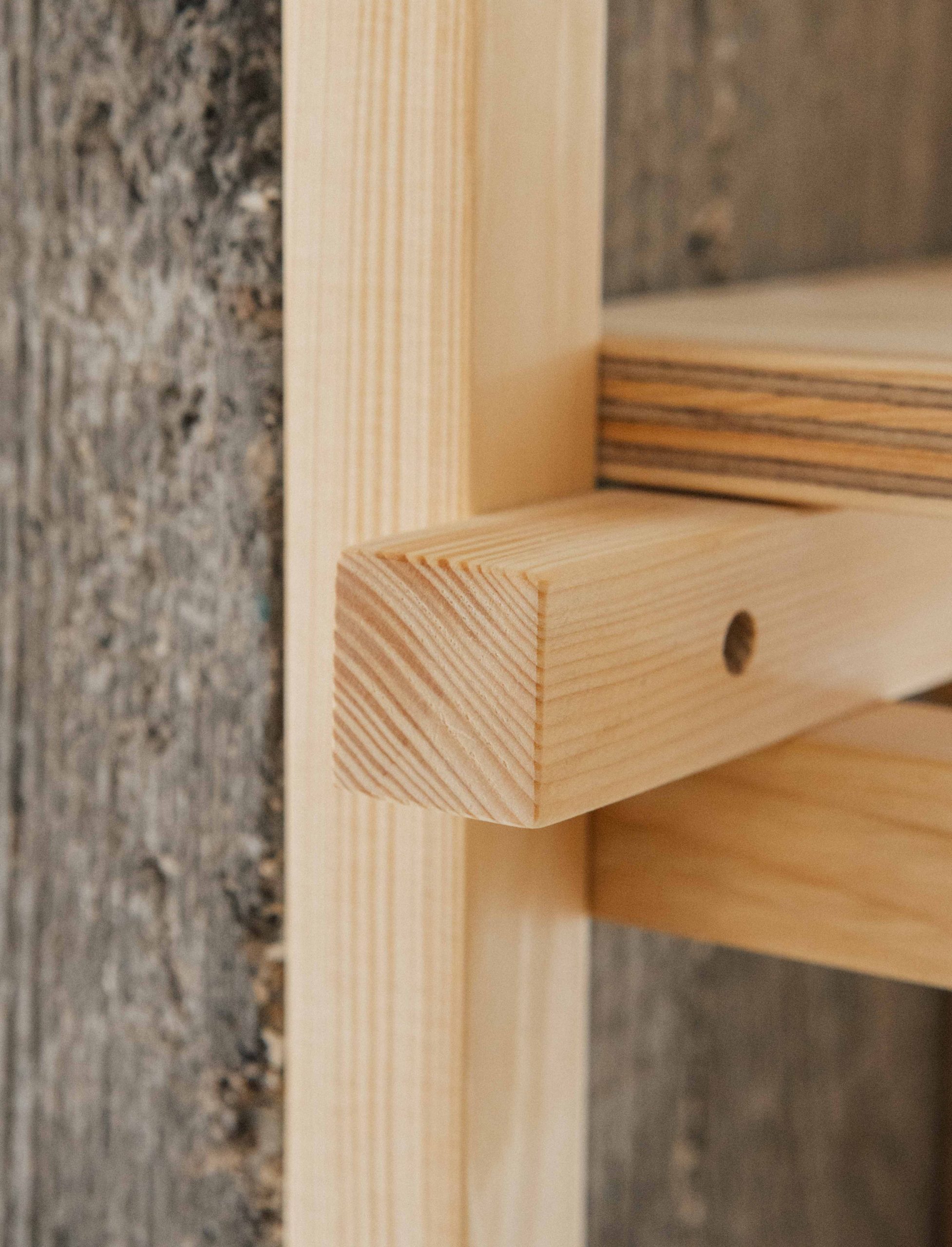L’atelier se déploie à partir d’une structure en tasseaux de sapin, mise en œuvre selon un principe d’assemblage simple et répétitif, habillée de panneaux de contreplaqué de sapin.
